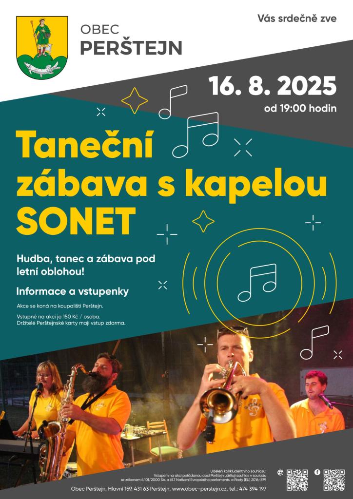 Obec Perštejn vás zve na letní taneční zábavu, kterou bude provázet kapela SONET v sobotu 16. srpna 2025 od 19:00 na koupališti v Perštejně.