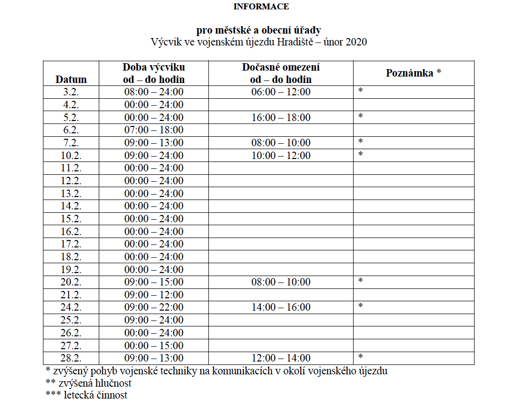V únoru by nemělo docházet k výskytu zvýšené hlučnosti ani k letecké činnosti, pouze k pohybu vojenské techniky na komunikacích v okolí vojenského újezdu.